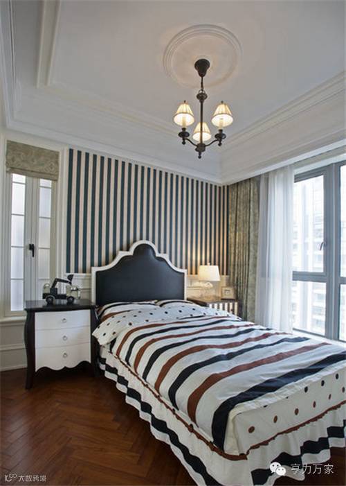 白色的护墙配上深紫色系的墙纸,温馨而又浪漫,用浅色的家纺作为点缀,越发显的悠闲雅致,床头灯采用了水晶装饰,晶莹剔透闪着优雅的光泽。