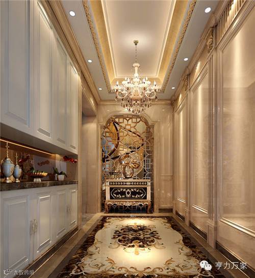 护墙板纹理自然,干净明亮,间隙中陈列的装饰摆件让门厅活力十足,多了一丝浪漫。玄关柜呈现精致的桌脚、细腻的纹路,令这个幽静的过道引领你开启华丽的篇章。