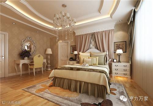 地毯呈现硕大的蝴蝶图案,颇具强大的视觉冲击力。雕花纹路作为镜框修饰,使卧室流露着颇为高贵而典雅的气质。