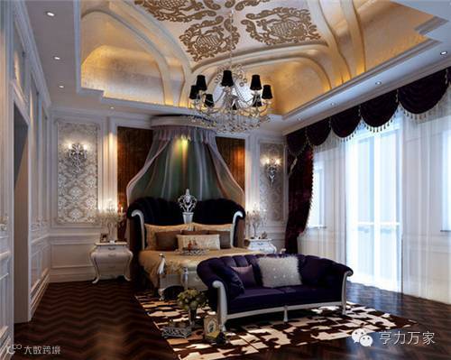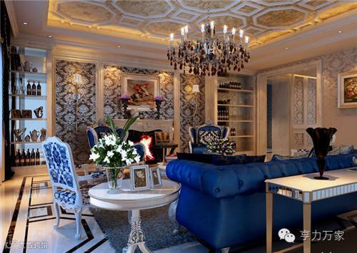 选取镶金的色彩与连贯简洁的乳白色进行渲染,无疑增添了客厅的艺术元素。硕大面积的深邃蓝运用在宽敞舒适的沙发之中,不仅呈现一种沉稳内敛的美感,也丝毫不抢欧式烛台吊灯的浪漫风采。