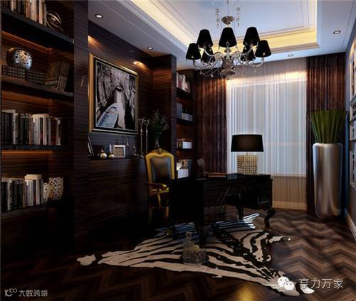大小不一的黑白装饰画充实了位于右侧的背景装饰墙,整齐排列的书籍增添了空间的文化气息。同样是铺垫于书房的地毯,用浮夸新颖的斑马皮艺作为装饰,结合了现代与古典美学的底蕴,显得格外创意奇特。