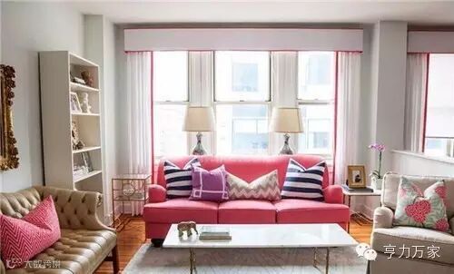 客厅以白色为背景,采用粉红色的布艺沙发、棕色的皮质沙发和浅灰色的单人沙发来丰富空间的色彩。而选用条纹和几何纹理的抱枕来增添客厅的活力感,长方形灰色羊绒地毯又使得客厅恢复平静的气氛。