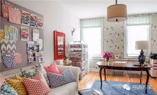 家庭室以白色为主,选用白色的沙发,搭配红色、黄色、蓝色、绿色的抱枕,丰富了整个家庭室的色彩。蝴蝶图案的壁纸,让空间充满了春天的气息。