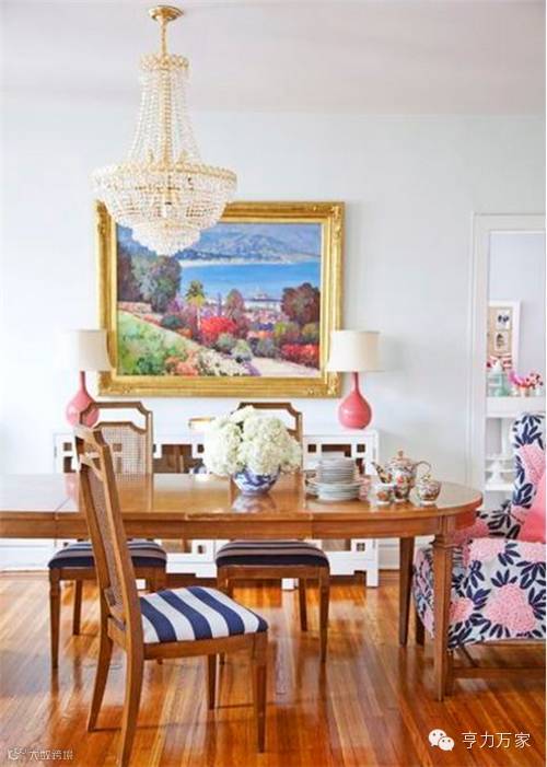 椭圆形的实木餐桌、实木餐椅与地面的材质相互呼应,营造温暖和自然的空间氛围。碎花沙发、条纹座垫和桌面的鲜活,使得餐厅极具夏日的活力。餐桌上方唯美的水晶吊灯,优雅而奢华,让家庭的聚餐氛围变得浪漫非凡。