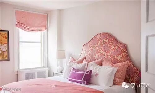 红色的窗帘、抱枕、床单以及紫色的抱枕,在色彩上床头靠包相呼应,使得卧室充满甜蜜和浪漫的感觉。