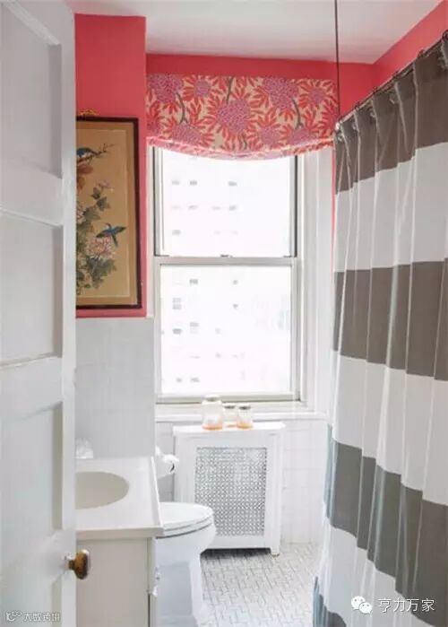 卫生间以白色为主,整齐而干净,选用红色碎花窗帘和黑白粗条纹的淋浴帘来丰富卫浴空间的色彩。