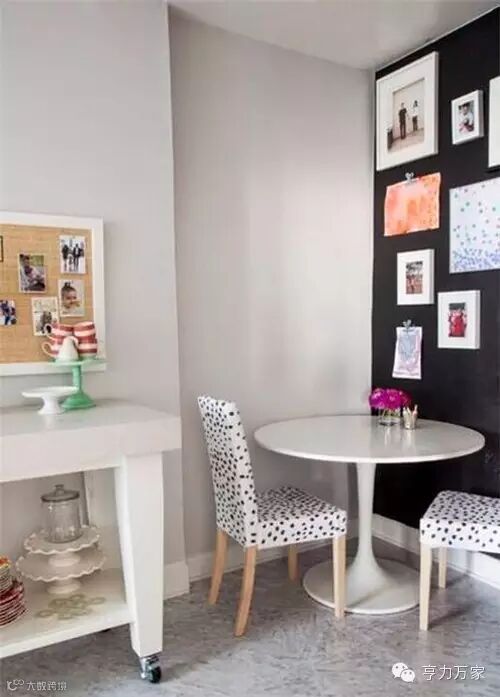 厨房的墙角分割出一个空间,白色的亚克力圆桌,搭配上两把黑白点的靠背椅,形成一个小小的多功能空间,可以是餐饮区,可以是会谈区,也可以是阅读区。
