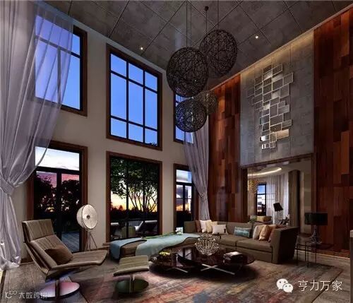 客厅的设计动线流畅,空间通透,运用一些木饰面、艺术漆,使空间更具灵动性。个性的吊灯设计,几何图案的背景墙装饰,挑高的客厅空间,使整个客厅充满大自然的气息。
