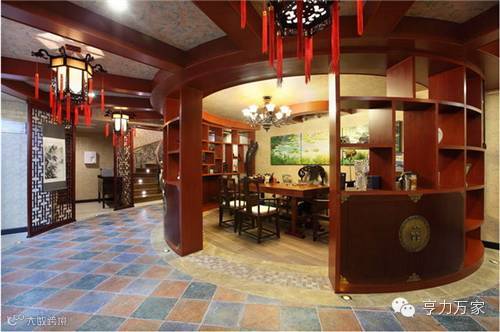 用格子架将书房空间隔成半圆形,通透的视觉效果使小小的书房不会有狭窄的感觉,反而透着别致、浪漫的气息,书房外走廊用中国宫廷灯装饰,融入了中国元素,增加了古典美感。