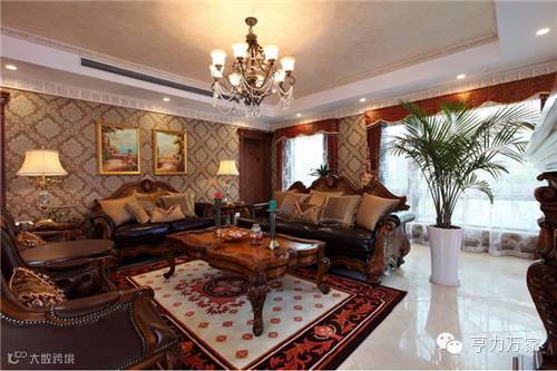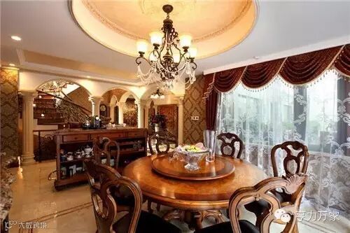 多个拱形门洞将客厅、餐厅打造成开放式的格局,整体空间明亮开阔。进门就可看到公关区域,既生活便利又方便招待亲朋宾客。罗马柱造型稳重大气,给人豪华气派感。大量使用富有典型美式风情的几何图案壁纸,其土黄或淡黄的色调不仅与整体风格统一,还有着浓郁的怀旧感觉。室内的每个空间都用了大型绿植装饰,还将阳台用透明玻璃吊顶打造成了阳光房,充分满足了美式风格对自然舒适的追求。