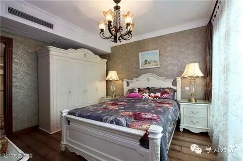 美式风格崇尚自然民主,以居住者感受为先,用白色有些简约欧式风格的衣柜和浅灰色墙面营造了一个轻松、简洁的氛围。用花朵图案的蓝紫色床品给这个空间提升色彩亮点,花型吊灯和床头台灯散发的暖色灯光,给空间带来温馨、舒适的感受。