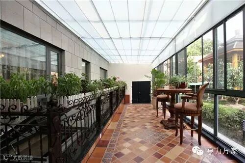 用透明玻璃的吊顶和落地窗将室外光线全部引入,把室内阳台打造成一个阳光小屋。大量的绿植,让整个空间处于自然清新的氛围中,也能改善室内环境,一举两得。