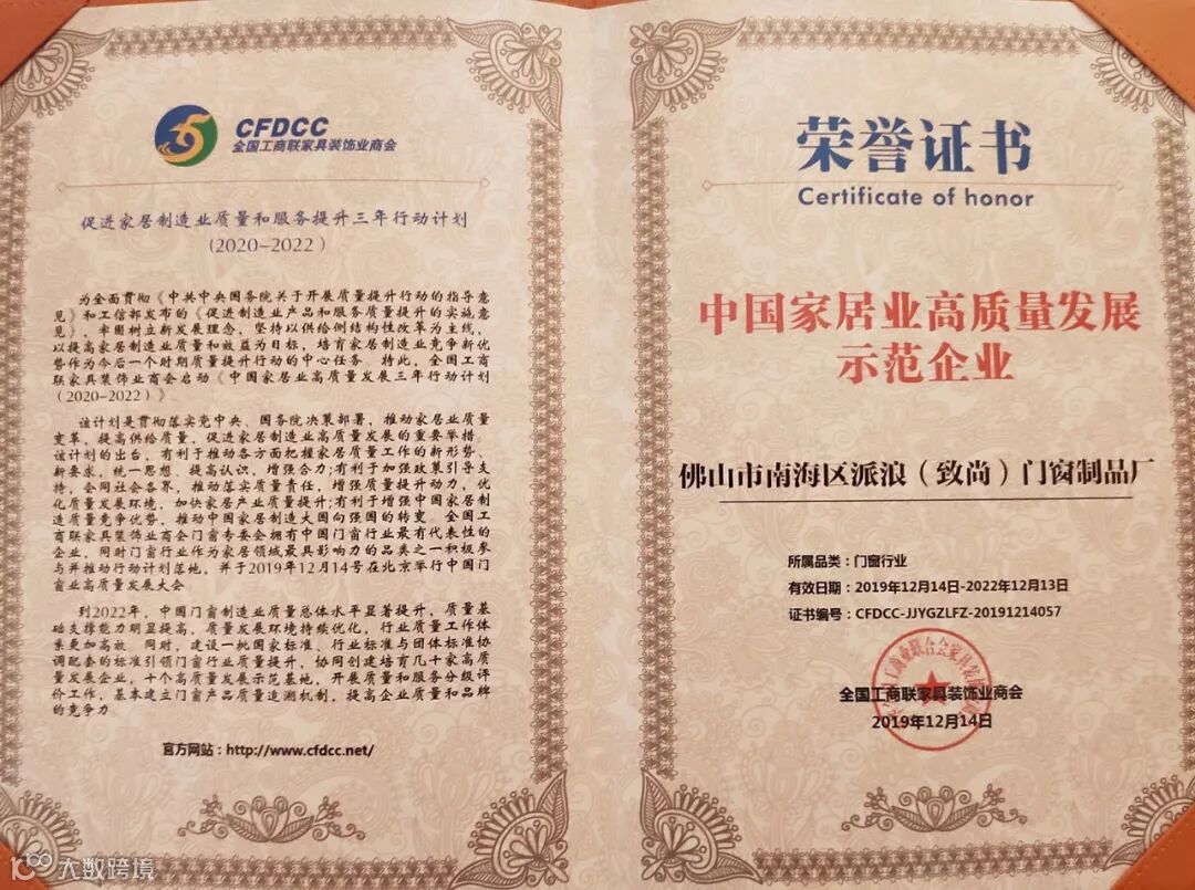 致尚门窗荣膺“中国家居业高质量发展示范企业”称号