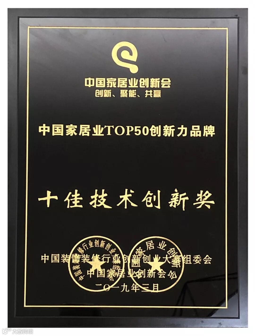 荣获中国家居业TOP50创新力品牌“十佳技术创新奖”