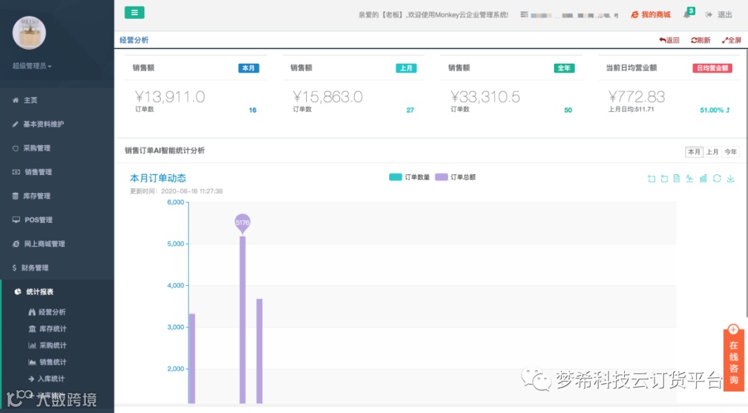 「现在,我随时都能看到商品在不同区域,不同客户中的销售情况、不同商品的销量排行,以及不同客户的订单统计等数据。通过数据分析,我们能更好了解客户的需求,制定出相应的服务策略。比如,知道了某商品在A客户一段时间内销量不佳,我们会适当回购,然后分配给销量更好的客户,加快商品流转,减少客户的损失;我们还会基于客户每月的销量数据,为客户提供商品采购上的建议与指导。」白总分享到。