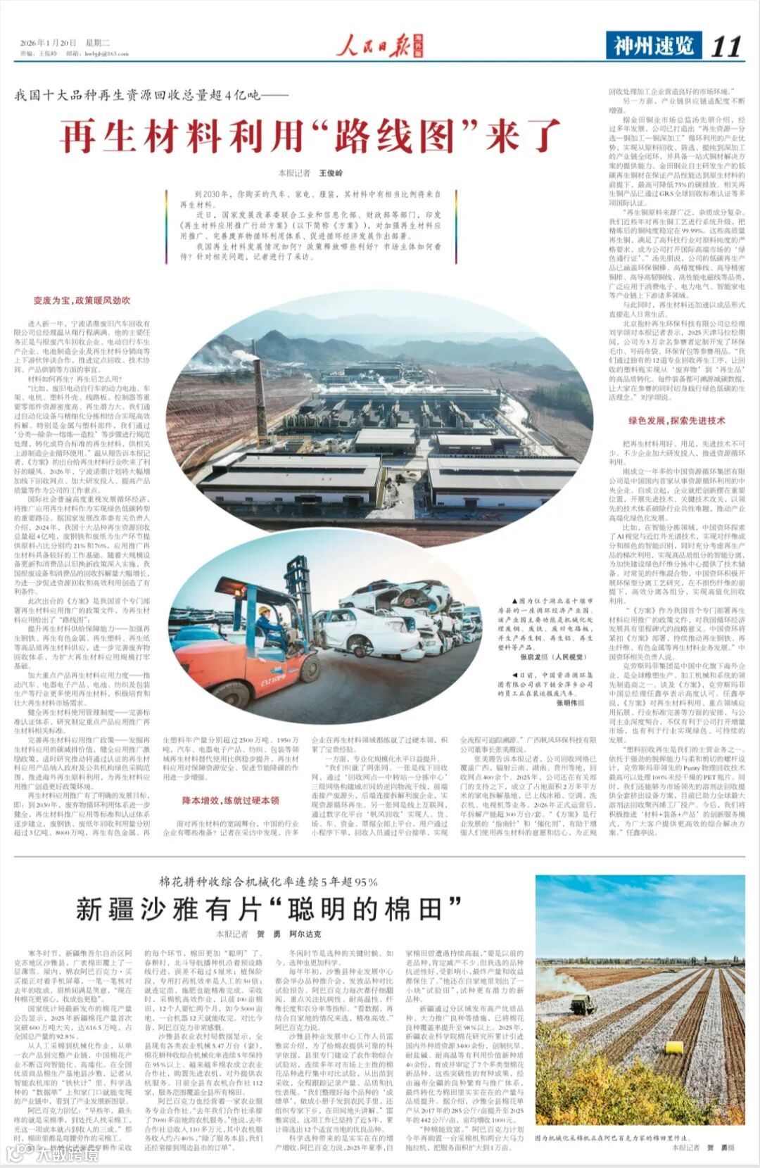 1月20日,人民日报海外版以《再生材料利用“路线图”来了》为题,聚焦国家发展改革委联合工业和信息化部、财政部等多部门印发的《再生材料应用推广行动方案》,全景呈现这一旨在加强再生材料应用推广、完善废弃物循环利用体系、助力循环经济高质量发展的国家级政策部署文件。作为循环经济领域的国资央企,中国资环勇担绿色发展使命,争当循环经济兜底保障者、政策执行者与标准探索者,积极为政策落地与产业升级注入动能。