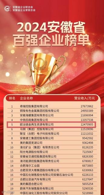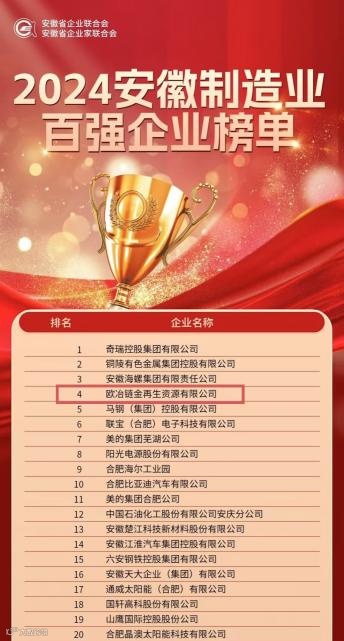 近日,安徽省企业联合会和安徽省企业家联合会进行了2024年安徽企业100强评选。欧冶链金再生资源有限公司位列安徽百强企业榜单第五、安徽制造业百强企业榜单第四。