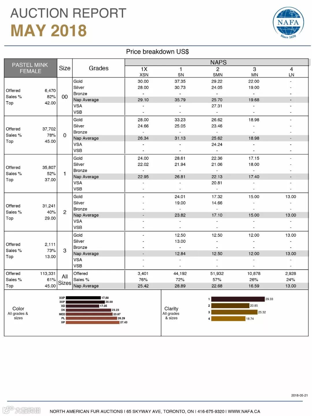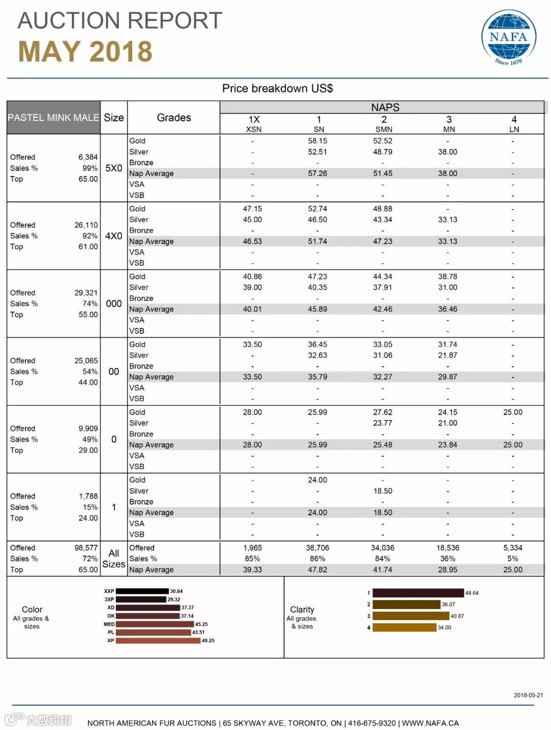 本周的水貂皮拍卖经历了一个艰难的开端,棕色系水貂和彩貂依然在这个市场上努力寻找一个稳固的价格立足点。不过NAFA很高兴地看到,毛皮行业对其独有的、产量有限的马赫根尼、本黑和帕斯条水貂精选系列的市场需求更为旺盛。因此,NAFA5月拍卖会水貂皮拍卖以一种更为强势的方式结束。