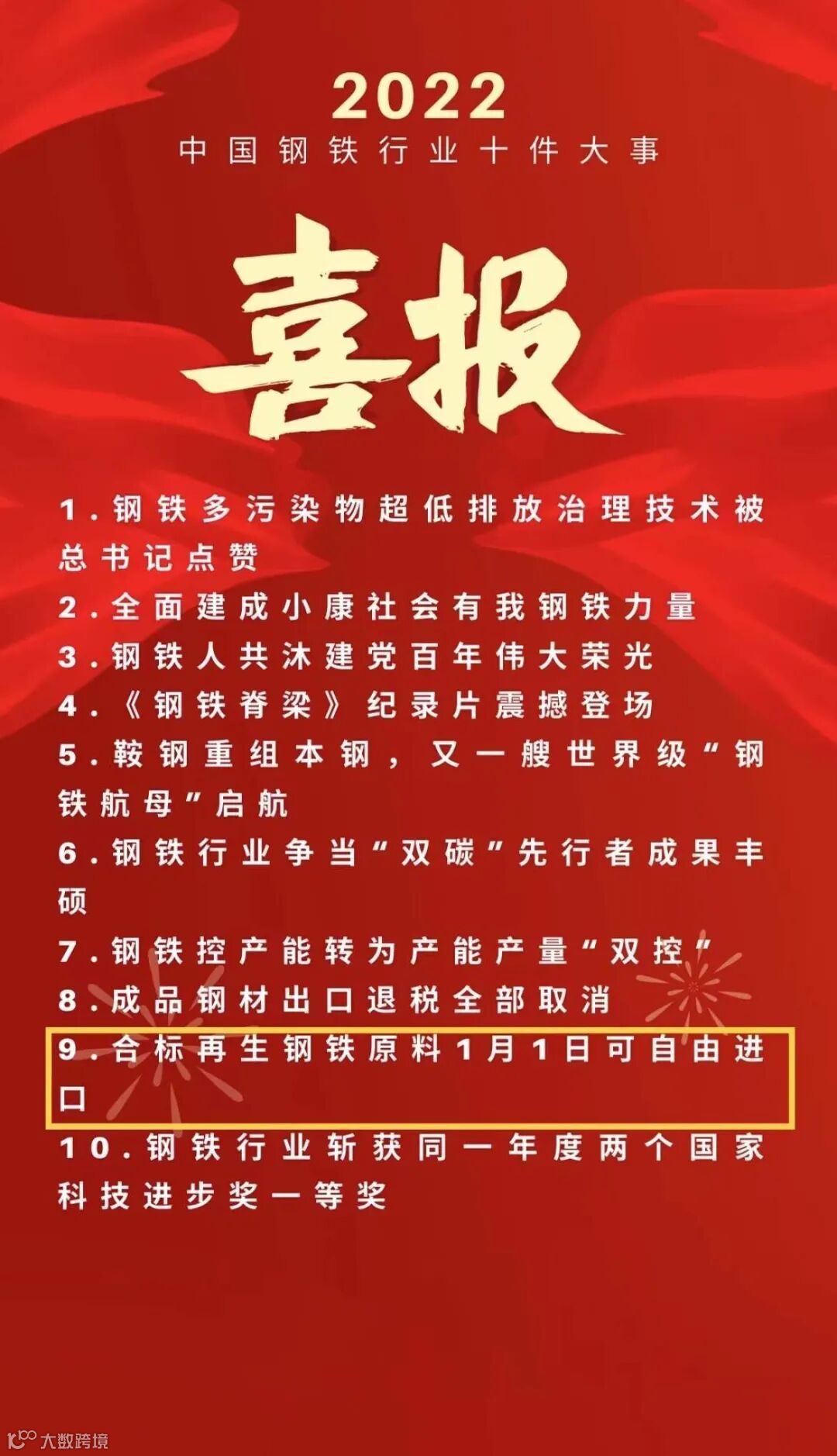 2021年1月1日,《再生钢铁原料》国家标准正式施行。根据生态环境部等5部委发布的《关于规范再生钢铁原料进口管理有关事项的公告》,自2021年1月1日起,合标再生钢铁原料不再属于固体废物,可自由进口。1月29日,欧冶链金从日本运抵上海的3002吨进口再生钢铁原料顺利通过海关验收,这是《再生钢铁原料》国家标准正式施行后完成的首笔国际订单。合标再生钢铁原料可自由进口成为提升我国铁素资源保障能力的重要手段。