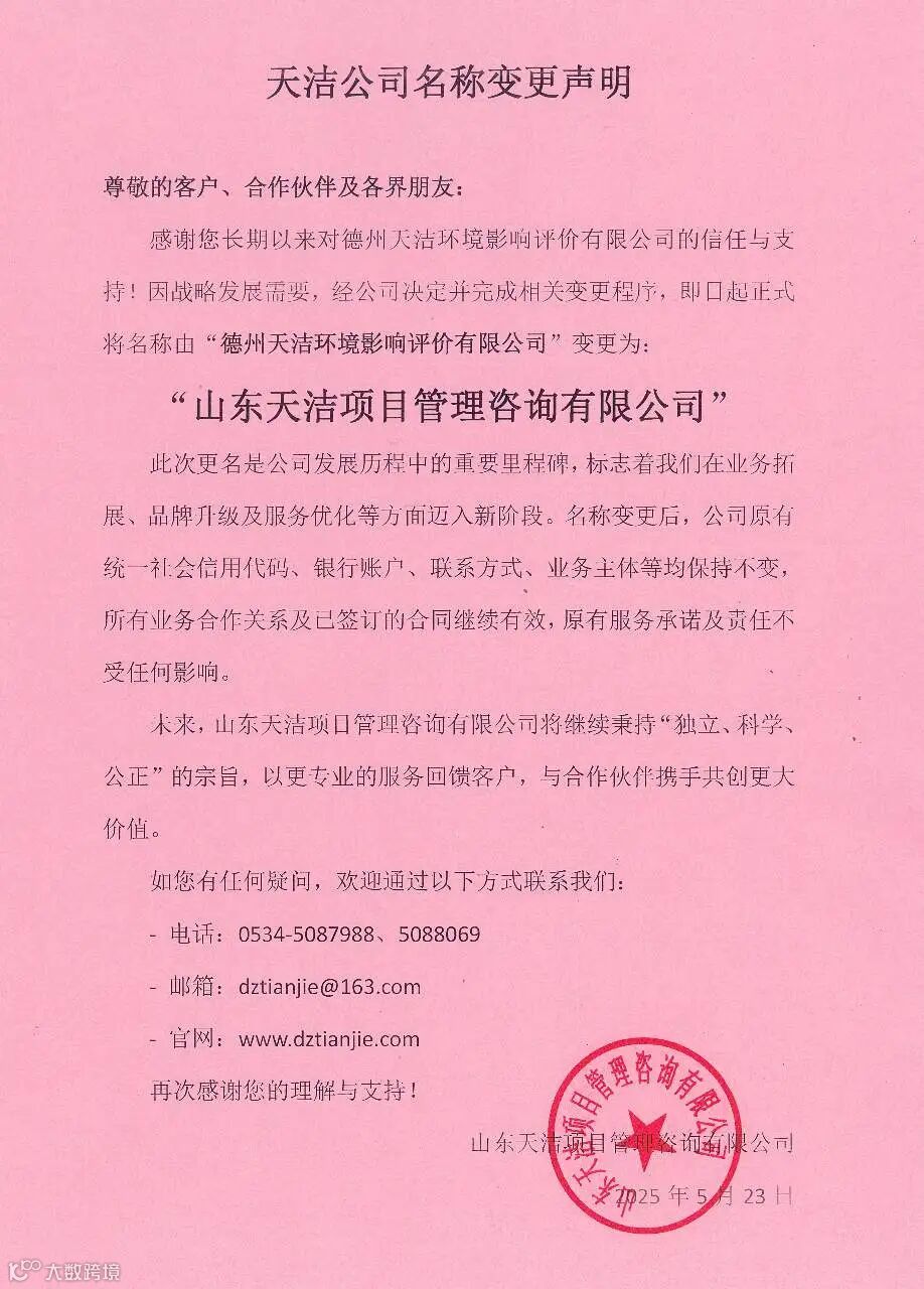 重要声明:即日起我单位名称变更为:山东天洁项目管理咨询有限公司