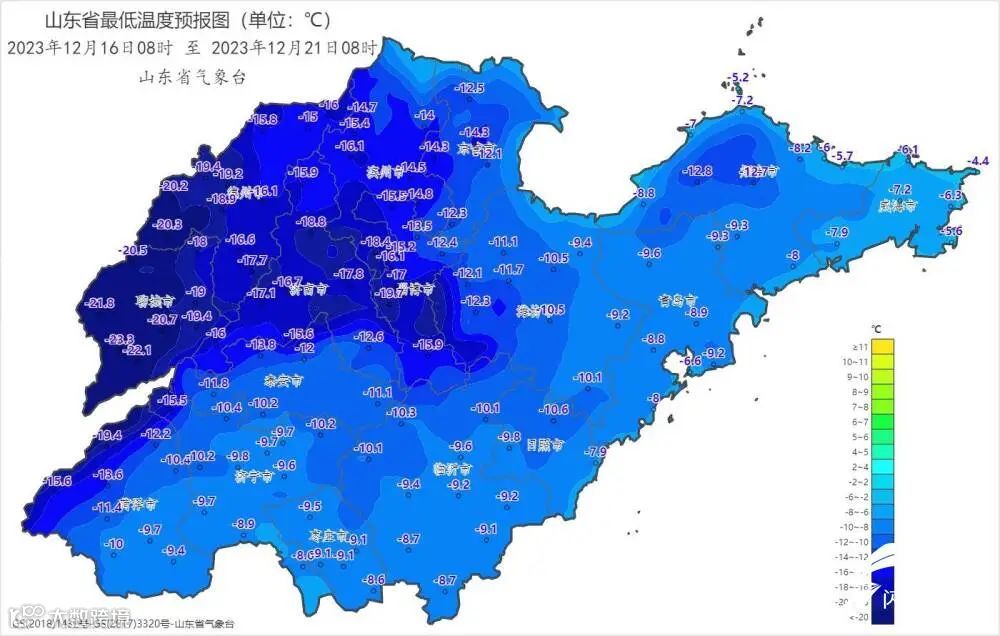 持续低温:16—21日,山东气温明显下降,将出现持续性极端低温,部分地区最低气温可突破12月中旬历史极值。16—21日最低气温:鲁西北和鲁中地区-18~-13℃,局部低于-20℃,沿海地区-9~-5℃,其他地区-12~-7℃;期间,全省大部地区最高气温低于-3℃。