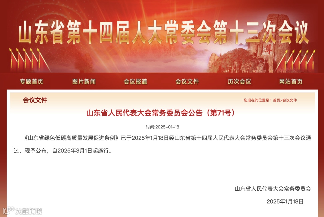 《山东省绿色低碳高质量发展促进条例》(以下简称《条例》)已于2025年1月18日经山东省第十四届人民代表大会常务委员会第十三次会议通过,自2025年3月1日起施行。