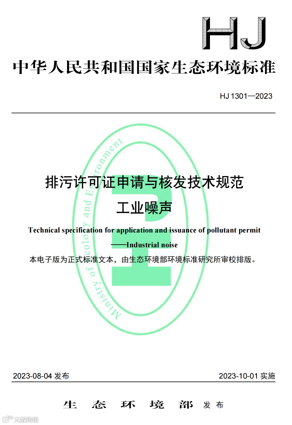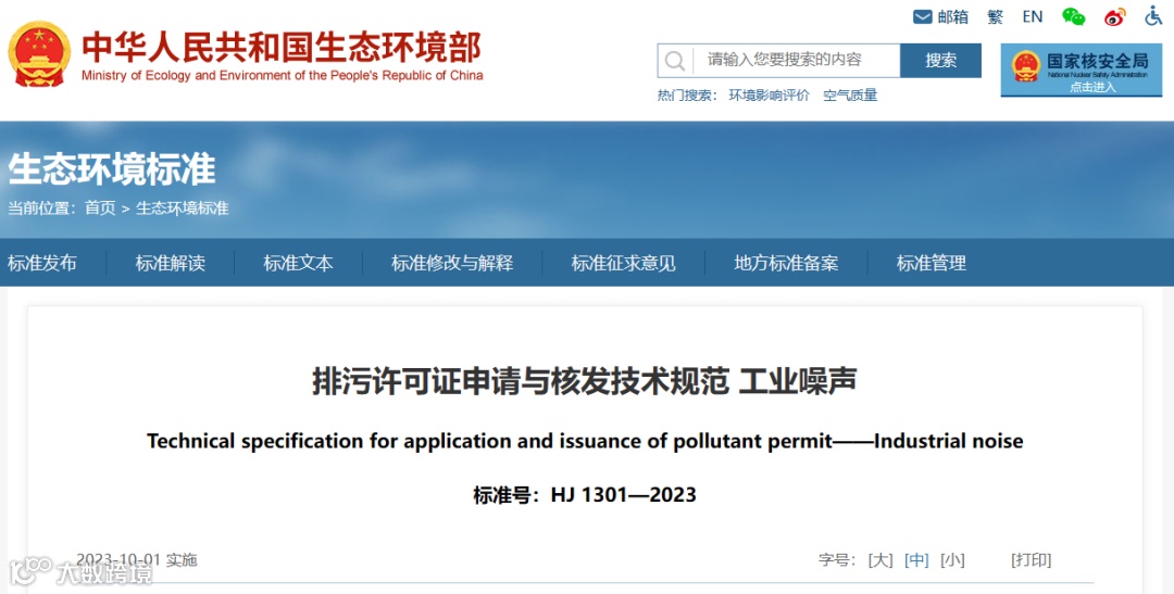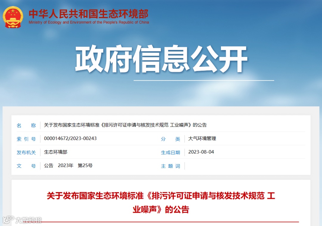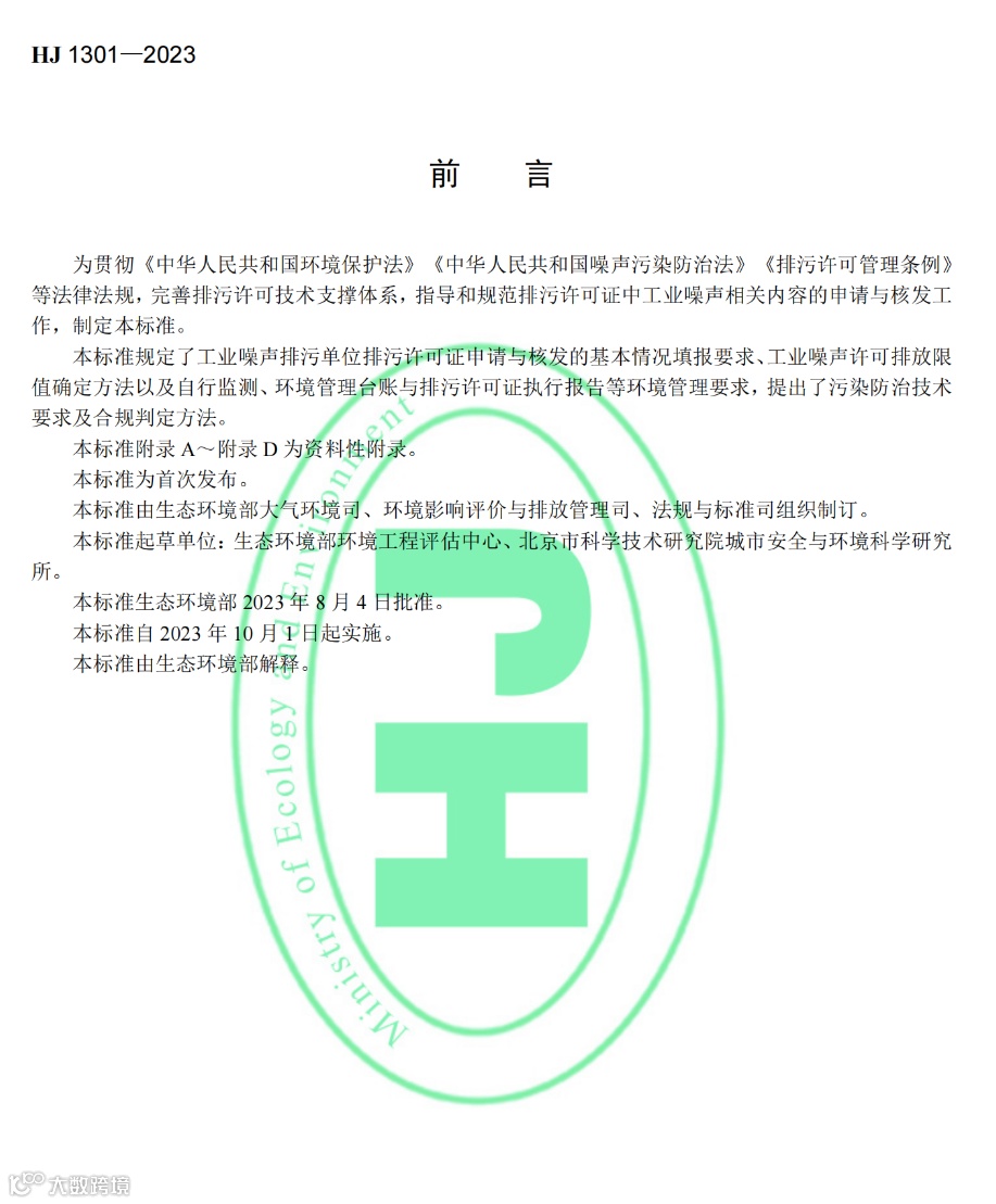 近日,生态环境部批准发布了国家生态环境标准《排污许可证申请与核发技术规范 工业噪声》(HJ 1301-2023)。本标准为首次发布。本标准将于10月1日起实施。