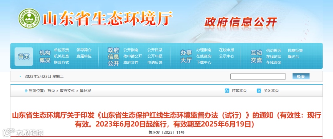 6月20日起施行,山东省生态环境厅发布《山东省生态保护红线生态环境监督办法(试行)》