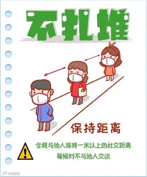 二、做好个人防护。要正确佩戴口罩,与他人保持安全距离,避免交谈和随意走动。