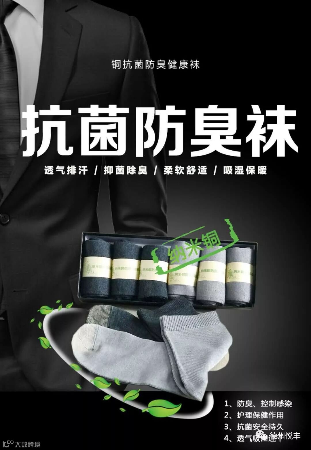 您还在为脚臭、脚气发愁吗?您还在苦苦找寻一双让您满意的袜子吗?在这里,您不用再发愁,我们采用特定混纺比的铜抗菌保健功能纱制作的袜子,可以穿7天不用洗,永久性地防臭、控制感染;强效杀菌、护理保健、抗菌安全持久。这是一款会呼吸的抗菌防臭保健袜,透气吸湿速干,让您的双脚从此告别脚臭、脚气,让您的双脚轻松舒适,永久地处在一个无菌的环境中。