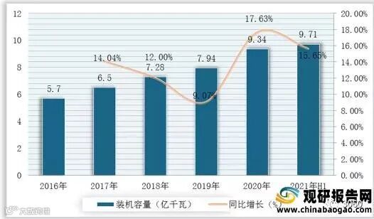 可再生能源包括水能、风能、太阳能、生物质能等,是绿色低碳能源。根据数据显示,2020年我国可再生能源发电装机容量达9.34亿千瓦,较2019年同比增长17.63%;2021年上半年我国可再生资源发电装机容量达9.71亿千瓦。