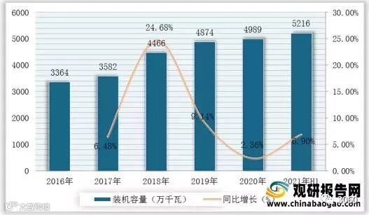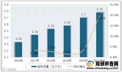 2016-2021年H1我国可再生能源发电装机容量及增速
