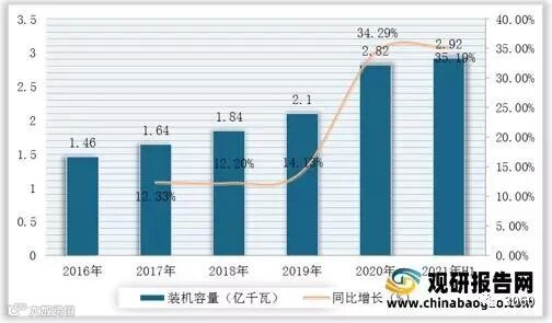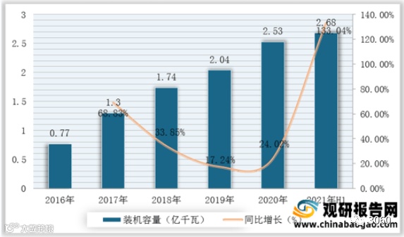 光伏发电是利用半导体界面的光生伏特效应而将光能直接转变为电能的一种技术。主要由太阳电池板(组件)、控制器和逆变器三大部分组成,主要部件由电子元器件构成。根据数据显示,2020年我国光伏发电装机容量为2.53亿千瓦,较2019年同比增长24.02%;2021年上半年我国光伏发电装机容量为2.68亿千瓦。