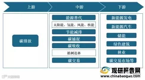 碳中和是指企业、团体或个人测算在一定时间内,直接或间接产生的温室气体排放总量,通过植树造林、节能减排等形式,抵消自身产生的二氧化碳排放,实现二氧化碳的“零排放”。碳中和行业产业链上游为碳排放,中游为碳中和,主要包括能源替换、节能减排、碳吸收、碳交易等;下游为应用领域,主要包括新能源发电、储能、绿色建筑、林业、碳交易市场等。