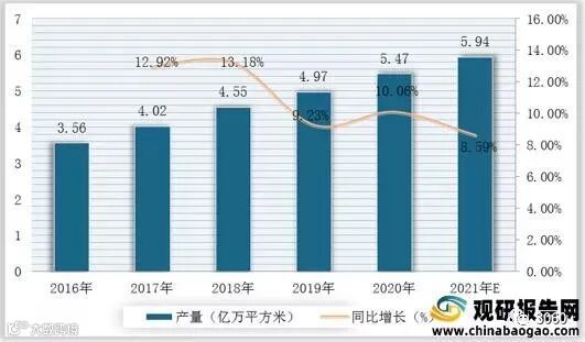 光伏玻璃是一种通过层压入太阳能电池,能够利用太阳辐射发电,并具有相关电流引出装置以及电缆的特种玻璃。根据数据显示,2019年我国光伏玻璃产量为4.97亿万平方米,2020年我国光伏玻璃产量为5.47亿万平方米,同比增长10.06%;预计2021年我国光伏玻璃产量可达5.94亿万平方米。