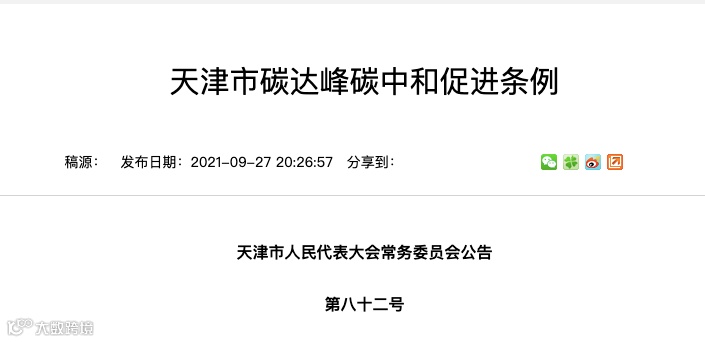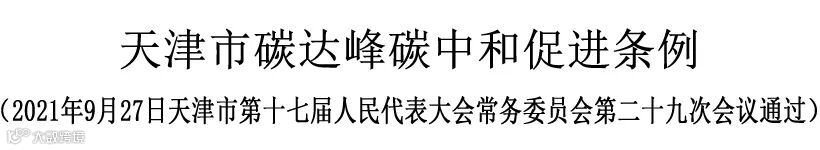 《天津市碳达峰碳中和促进条例》已由天津市第十七届人民代表大会常务委员会第二十九次会议于2021年9月27日通过,现予公布,自2021年11月1日起施行。
