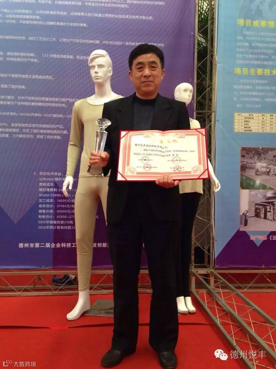 大赛上,恒丰集团德州悦丰科技展示了其自主研发的新型铜抗菌保健光洁纱线及其成品。铜抗菌保健光洁纱线,是德州悦丰科技独家开发生产的新型环保、抗菌、除臭、防螨、防霉、保健产品,经国家权威认证检测机构检测,产品抑菌率均在99%以上。 新型铜抗菌保健光洁纱线的诞生,开辟了一个新型保健、健康的穿着新理念,让人们在美观、舒适的追求中,融合更高的环保、健康需求,实实在在地体会到看得见的健康和幸福。公司总经理刘玉庆在大赛上对新型铜抗菌保健光洁纱线的研发工艺及成品的抗菌、保健功能进行了精彩的答辩,并荣获了科技创新成果金奖。颁奖结束后,德州市电视台对刘总进行了专题采访,同时,德州市统战部、宣传部、市委常委等部门领导、各评委专家以及各参赛公司代表莅临恒丰集团德州悦丰科技展位了解铜抗菌保健产品,恒丰集团德州悦丰科技也成为展会上最为火爆的展位。此次参赛产品得到了各位的高度重视和认可,为恒丰集团的新产品开发和推介再一次赢得了荣誉。