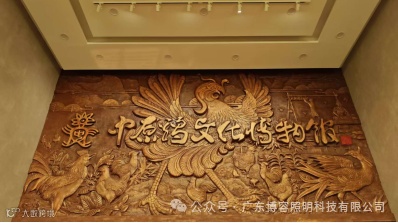 当踏入博物馆序厅,一面气势恢宏的 “鸡文化浮雕墙” 率先闯入视野。为精准营造出历史的深邃与沧桑之感,我们选用了博容照明的 65 系轨道射灯,功率为 15W,色温设置在 3500K,显色指数高达 95Ra,搭配 9 - 45° 变焦以及 24°、36° 固定角射灯,并结合拉伸洗墙配件。低色温的暖黄色光线,恰似时光长河中缓缓流淌的涓涓细流,轻柔且细腻地漫过每一块承载着岁月痕迹的文字与图片。
