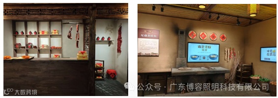 这些射灯的巧妙运用,不仅将古老的烧鸡制作工艺以及发展脉络清晰呈现,还使展板的展示效果更加清晰,光斑分布均匀,固定角射灯对重点内容的照明,进一步强化了展示层次,而遮光扇叶有效遮蔽了多余光斑,实现了良好的防眩效果,若遇眩光严重的情况,还可增添防眩蜂窝片等配件加以优化。