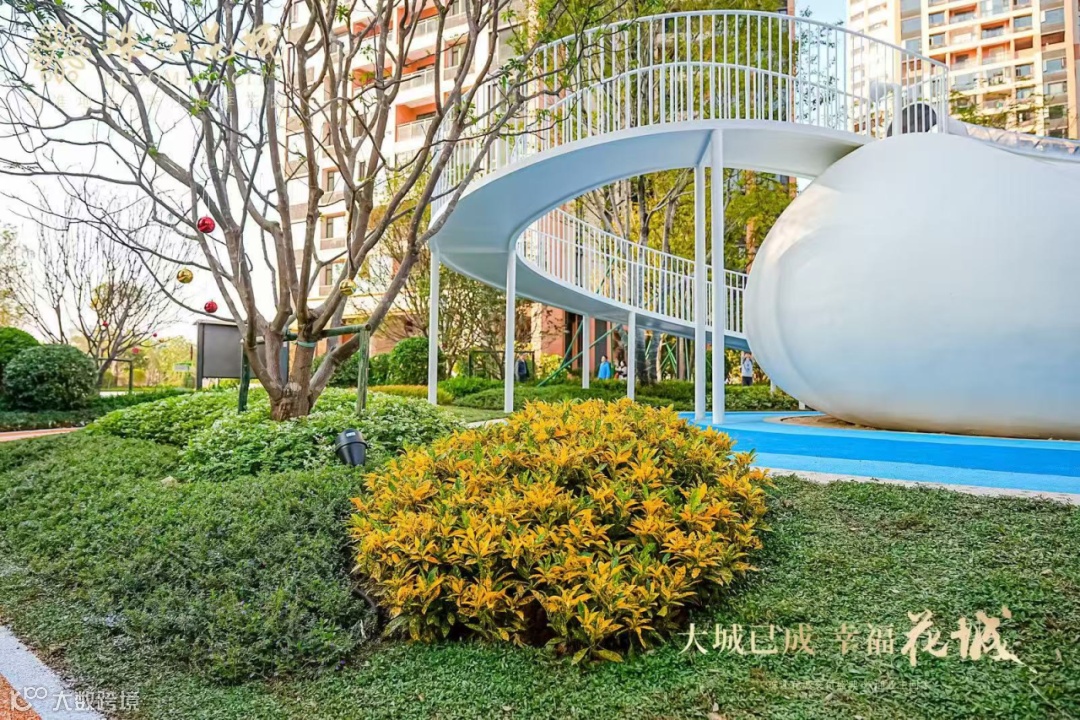 漫步园区,从全龄康体设施,到环线跑道,从儿童探险基地,到苍翠景观绿植,宽奢楼距间,目之所及,皆是理想生活的温馨点滴。
