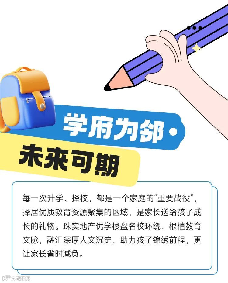 免责声明:本推广资料所涉文字、图片等仅供参考,不作为开发商的销售承诺及要约内容。买卖双方的权利义务以双方签订的《商品房买卖合同》及附件等协议为准。相关教育资源仅供参考,具体学校名称、办学性质、办学规模、学位设置、开学(班)时间、招生范围及入读条件均以实际入读时教育主管部门公布的政策为准,开发商对此不作任何承诺。部分文字、图片、视频、动画等来自网络,如若侵犯肖像权及著作权等知识产权,请联系我方删除。本宣传资料最终解释权归广州珠实地产有限公司及旗下各楼盘开发商所有。