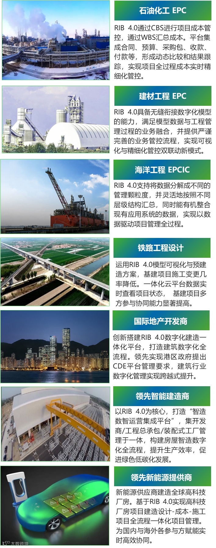 RIB 4.0在石油化工、建材工程、海洋工程、铁路工程设计、国际地产开发、智能建造和新能源等领域广泛应用,展现出卓越的价值。