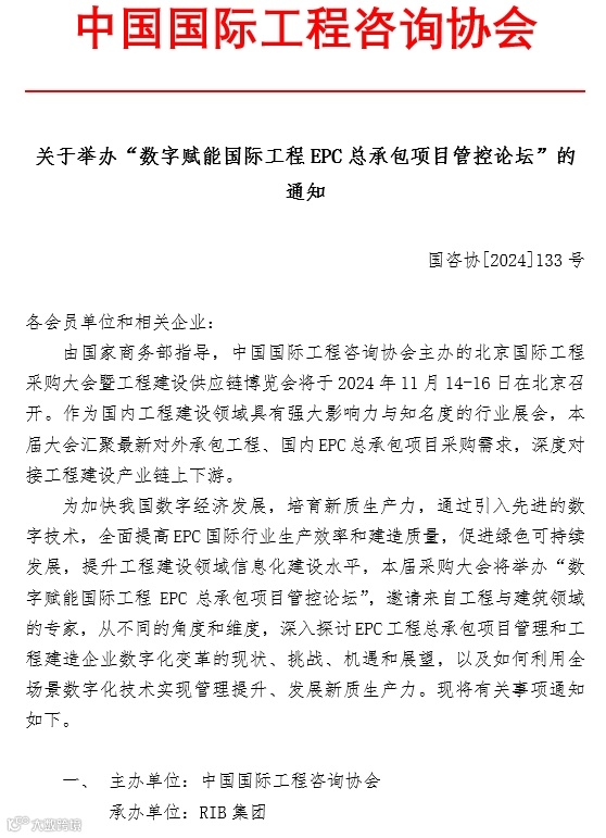 由国家商务部指导,中国国际工程咨询协会主办的北京国际工程采购大会暨工程建设供应链博览会将于2024年11月14-16日在北京召开。作为国内工程建设领域具有强大影响力与知名度的行业展会,本届大会汇聚最新对外承包工程、国内EPC总承包项目采购需求,深度对接工程建设产业链上下游。