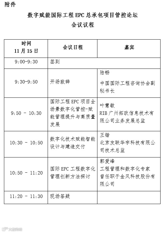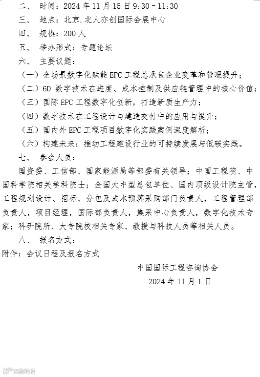 为加快我国数字经济发展,培育新质生产力,通过引入先进的数字技术,全面提高EPC国际行业生产效率和建造质量,促进绿色可持续发展,提升工程建设领域信息化建设水平,本届采购大会将举办“数字赋能国际工程EPC总承包项目管控论坛”,邀请来自工程与建筑领域的专家,从不同的角度和维度,深入探讨EPC工程总承包项目管理和工程建造企业数字化变革的现状、挑战、机遇和展望,以及如何利用全场景数字化技术实现管理提升、发展新质生产力。