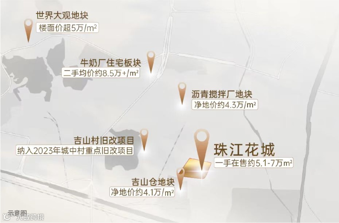 近两年,智谷片区土拍火热,珠江花城南侧的吉山仓地块(广园路北)7月成功拍出,净地价约4.1万/㎡。距项目直线距离3公里的世界大观地块以68.32亿元被竞得,楼面价约50160.3元/㎡,逼近珠江花城房价!