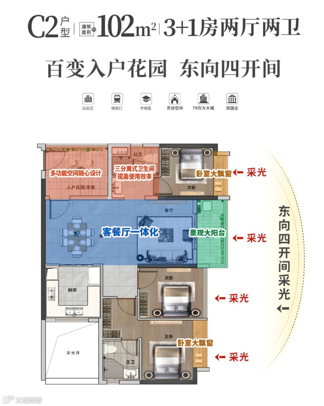 入户即花园,早起吸氧,饭后品茗,生活质感十分在线;东向四开间,无遮挡望白云湖景,每天早上尊享阳光“叫醒服务”;U型厨房设计,宽敞烹饪空间在欢聚时刻更能“大显身手”。