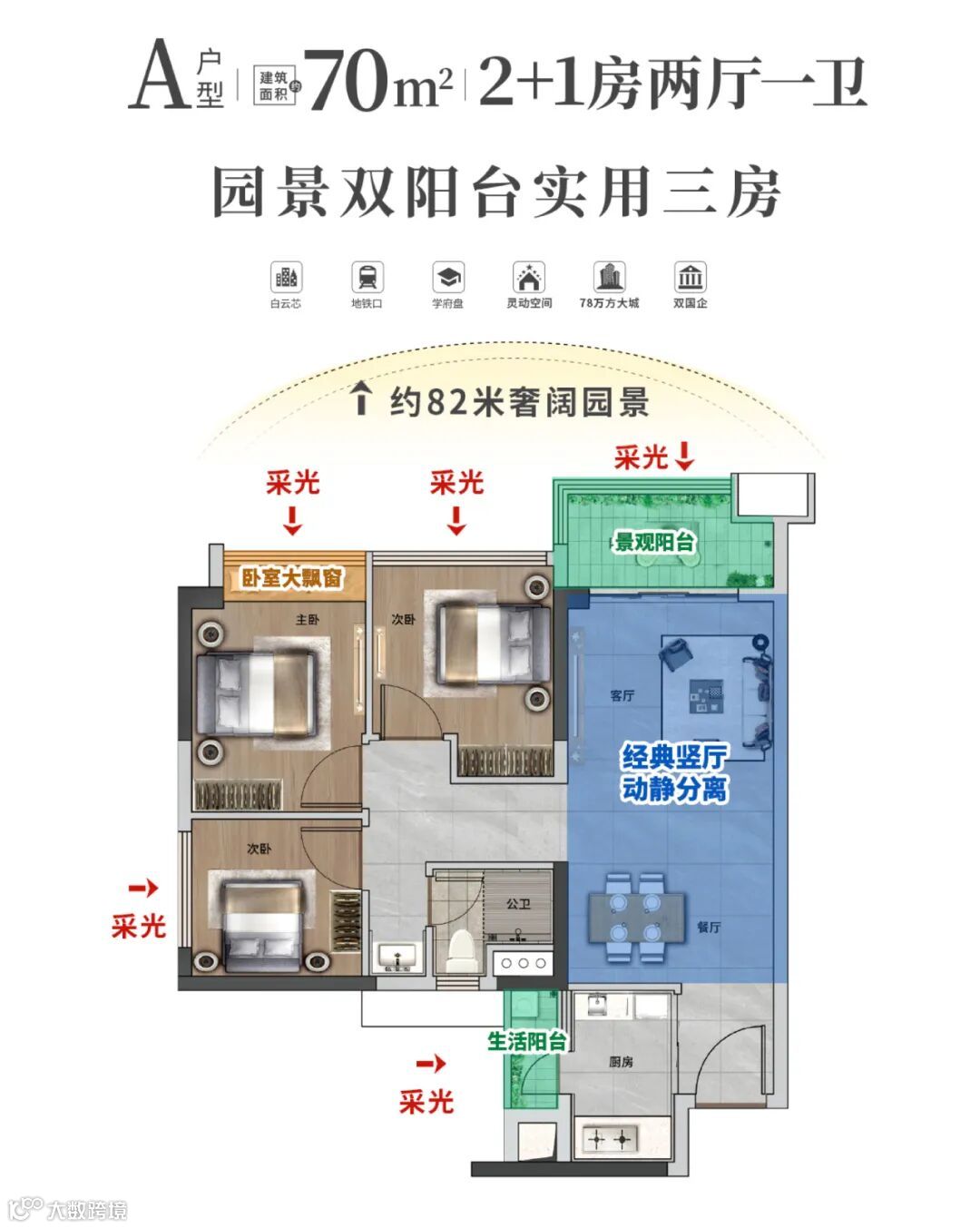 高效使用空间,两房空间做到三房享受。双阳台格局,让生活更添彩。景观大阳台,推窗即见约82米奢阔园景线,四季风光一览无余,生活阳台,可放置洗衣机、生活杂物等,集洗、晒、储于一体,整洁收纳井然有序。