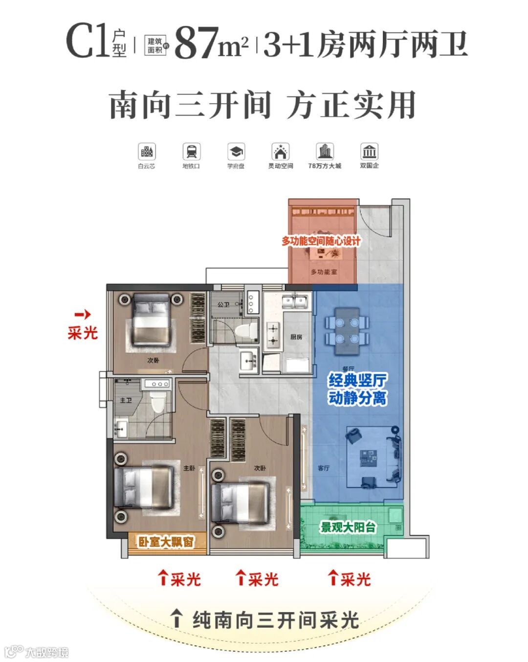 在广州主城区,能够做到小面积段+四房双卫+三开间朝南,十分罕有。面积不到90㎡,不仅能享受到主卧套房,而且拥有南向三开间的采光格局,舒适度与实用性都得到了充分保障。