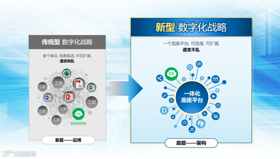 如果我们用一种传统的、信息化的思维去做数字化,我们会更注重做单点应用的数字化,会去采购数字化的软件、有更强功能的软件。但是这些软件对数据的依赖性更强,也会产生越来越多的数据。那么这些一个个对数据具有强烈依赖的应用,其实会形成更多的信息孤岛,使数字化转型难以进行下去。