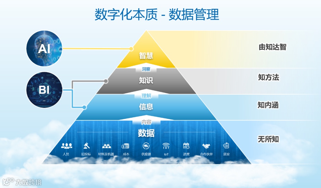当我们再提升一个阶段,到达数字金字塔顶端,利用人工智能(AI)的技术实现 “由知达智”,这就是数字化管理提升的过程。